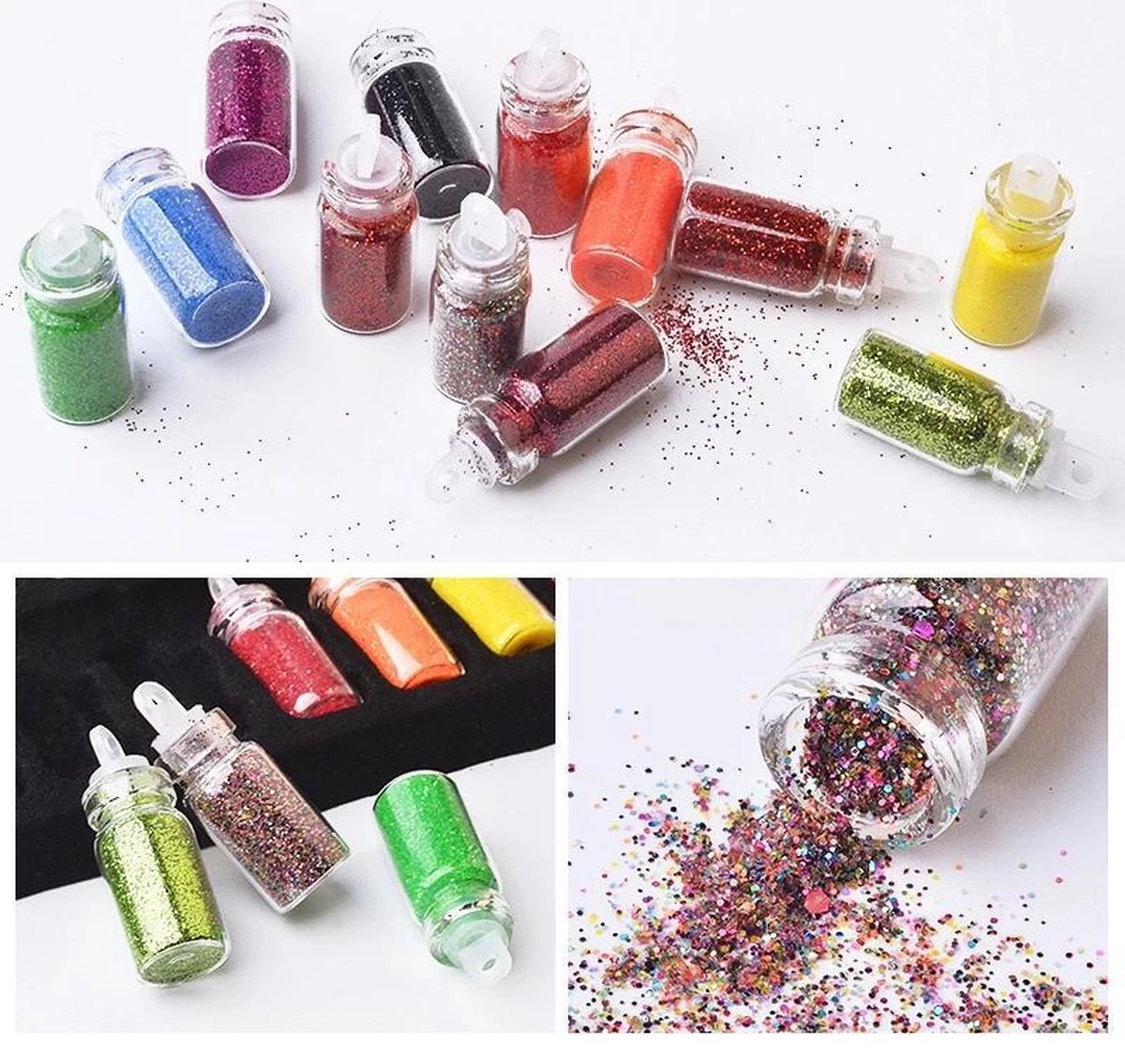 Niet alleen voor je nagels te gebruiken maar voor veel meer! 48 verschillende flesjes met vele kleuren aan glitter effecten. Elke soort/kleur wordt verpakt in een klein flesje met goede afdichting. Geschikt voor zowel professioneel gebruik als thuisgebruik.