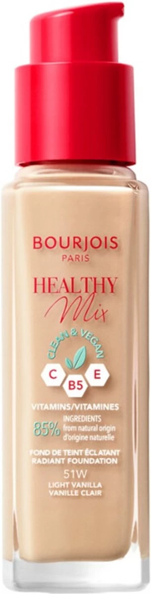 De geliefde Healthy Mix Foundation is nu clean & vegan! 85% van de ingrediënten zijn van natuurlijke oorsprong en is nu geformuleerd met x2.4 extra vitamines. Het toegevoegde complex van vitamine C, E en B5 verheldert de huid onmiddellijk en onthult je natuurlijk stralende teint.