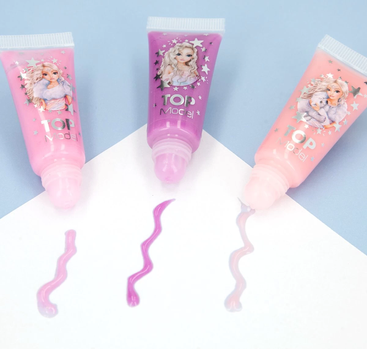 De lipgloss ICEWORLD van TOPModel is er voor ijssprookjesachtig mooie lippen! Verpakt in een schattig transparant tasje met handvat en strik. De roze lipgloss ruikt naar aardbeien, de paarse naar blauwe bessen en de nude lipgloss heeft de geur van perziken. Met mooie modellenprints. Inhoud: elke tube 9 ml.