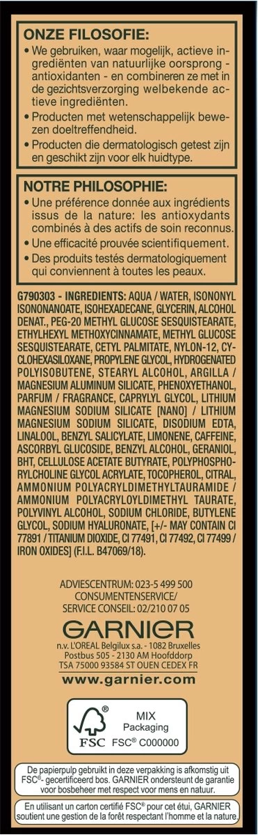 Met haar nieuwe formule geeft de BB cream van Garnier je nu tot 12u lang** een perfect ogende huid zonder bij te werken, zelfs in intense dagelijkse situaties: bij stress, warmte of contact van de handen op het gezicht, van ’s morgens tot ’s avonds. Deze 5-in-1 verzorging hydrateert tot 24u* en is verrijkt met grapefruit extract en vitamine C die zorgen voor een stralende en heldere teint. Het UV-filter SPF 15 helpt de huid beschermen tegen UV-stralen. Breng de BB-cream aan als een gewone dagverzorging op een gereinigde huid.