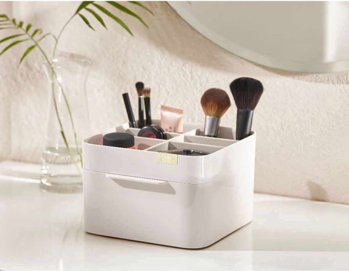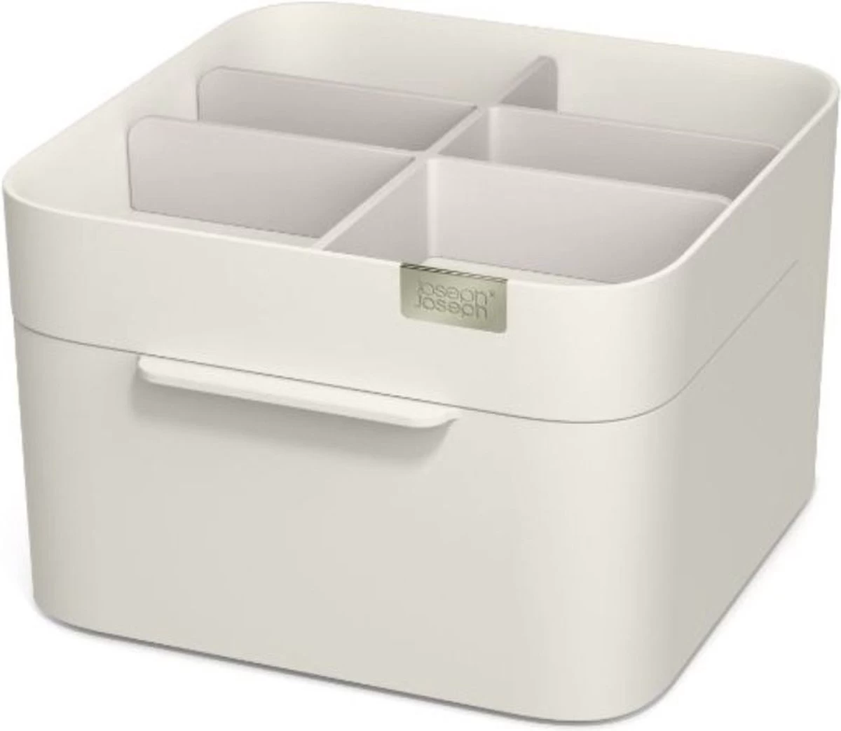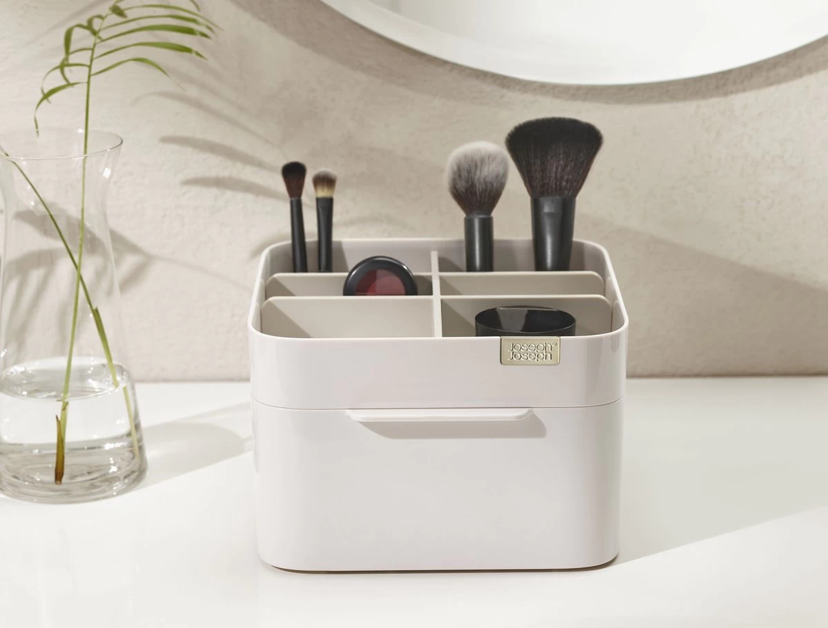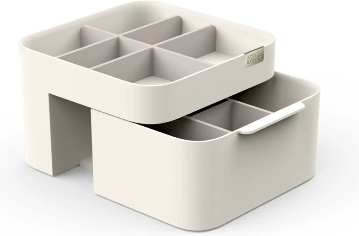 De opbergdoos voor make-up is niet alleen praktisch in gebruik door zijn vele sorteervakken en uitneembaar bakje, hij staat ook nog eens prachtig in je slaapkamer of badkamer. Het kleine exemplaar heeft 3 sorteervakken die perfect kunnen dienen als kwastenhouder. De grote variant van de make-up organizer heeft zes sorteervakken waar lipsticks, oogschaduwpotjes en crème in kan staan. Beide exemplaren van de cosmetica opbergdoos hebben een uitneembaar bakje waarin bijvoorbeeld wattenschijfjes of wattenstaafjes opgeborgen kunnen worden. Liever één grote bak om bijvoorbeeld parfum in te zetten? Haal simpelweg de uitneembare verdelers uit de make-up opbergdoos. Ook kun je nog in de Viva collectie van Joseph Joseph kijken of je een leuke combinatie kunt vinden.