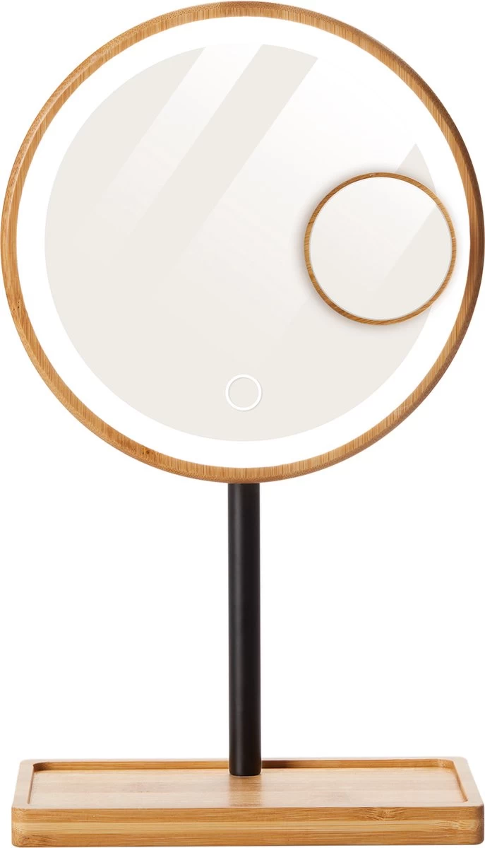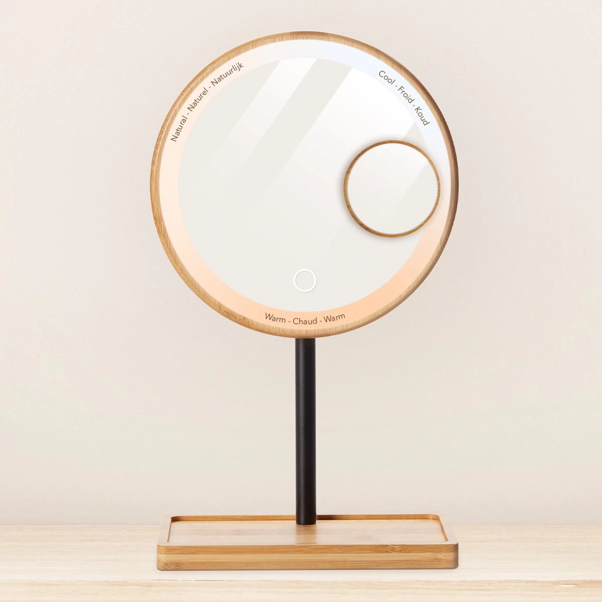 De oplaadbare staande spiegel Bamboo Mirror is elegant en modern en past perfect in uw interieur dankzij het design van bamboe en de zwarte afwerking. De spiegel X1 met een diameter van 15,5 cm wordt uw beste hulpmiddel voor uw dagelijkse verzorging. Voor extra precisie kan de magnetische X3 vergrotende spiegel gemakkelijk aan de hoofdspiegel worden bevestigd en er weer van worden losgemaakt.