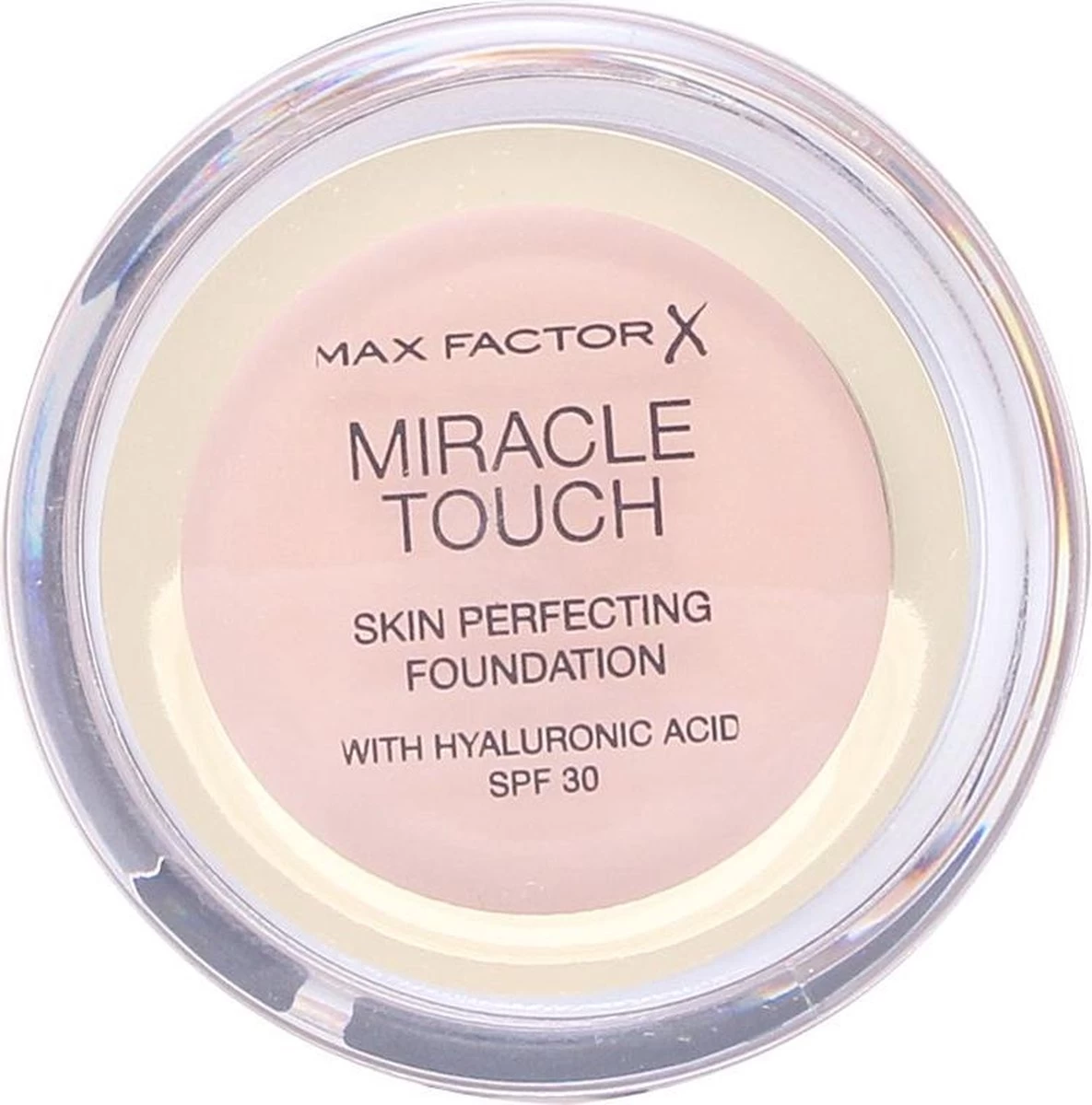 Max Factor Miracle Touch Foundation SPF30 is het iconische 3-in-1 product dat zorgt voor een frisse en egale huid, waar je ook bent. De geliefde compact-naar-vloeibare textuur is een concealer, foundation en poeder in één om de huid om direct een natuurlijke, onberispelijke finish te geven. De lichtgewicht, compacte formule veranderd door de warmte van de vingers in een vloeibare foundation en glijdt over de huid om grove poriën, oneffenheden en fijne lijntjes te camoufleren. Toevoeging van hyaluronzuur hydrateert en voedt de doffe huid en laat deze stralen. SPF30 helpt de huid te beschermen tegen schadelijke AVA,- en AVB stralingen en vermindert het risico op huidveroudering, veroorzaakt door zonschade. De Miracle Touch make up Foundation is eenvoudig aan te brengen en verspreidt moeiteloos over de huid voor een egale finish. De compacte verpakking maakt het eenvoudig om de foundation mee in je handtas te nemen, voor een snelle en praktische touch-up on the go. Gebruik de toegevoegde spons applicator om de dekking, daar waar nodig, naar wens op te bouwen.