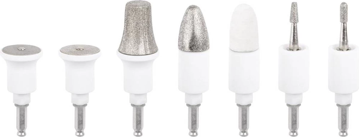 Inclusief 7 accessoires: saffieren kegel grof, fijne saffieren schijf, cylindervijl, vlammenfrees, viltkegel, naaldfrees