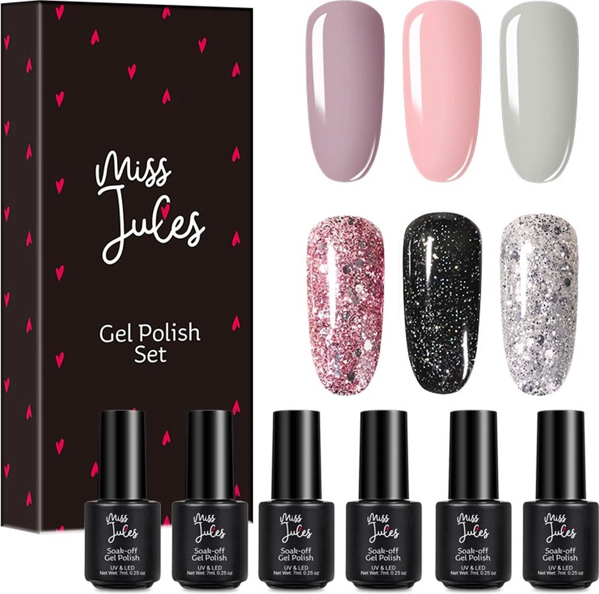Met deze 6-delige gel nagellak set van Miss Jules heb je keuze uit 6 trendy kleuren voor elke gelegenheid. Deze gellak kan zowel op een natuurlijke nagel als op een kunstnagel worden aangebracht.