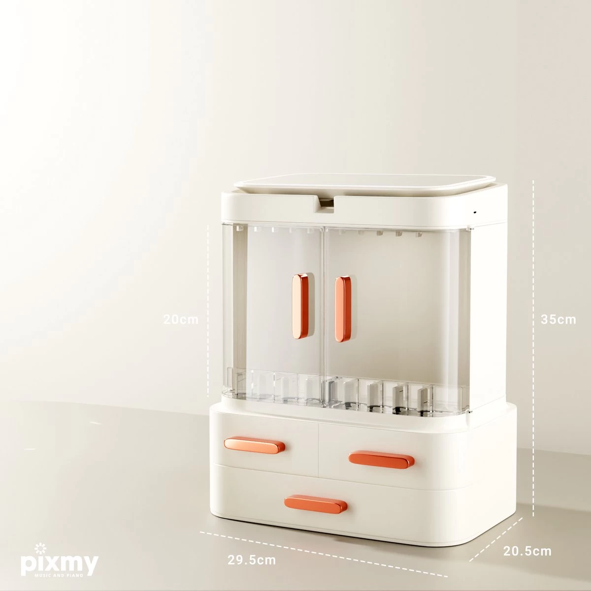 De lippenstift in de clutch, de handcrème in de waszak, de foundation in de kast. Veel te vaak zijn cosmeticaproducten over de hele woning verdeeld. De PIXMY® Make Up Organizer COML is perfect voor het opbergen van al uw cosmetica producten, sieraden en accessoires. Je plaats deze case eenvoudig op je bureau in je slaapkamer, of op het badkamermeubel in de badkamer. De deurtjes aan de voorkant van de organizer zijn voorzien van een magnetische afwerking, waardoor je ze eenvoudig open en dicht klapt. Door het smooth design van drie uitklapbare laadjes onderin de organizer, is er een mogelijkheid om sierraden of platte voorwerpen op te bergen. Daarnaast, hang je eenvoudig je kettingen, armbanden, en oorbellen op aan de houder in de binnenkant van de deurtjes. Dit maakt deze organizer een echte 3-in-1 organizer! De case bevat hoogwaardige kunststof kwaliteit, dat voor extra stevigheid zorgt. Op de bovenkant klap je eenvoudig de spiegel uit, die 180 graden kantelbaar is en 360 graden kan draaien. Het doen van je make-up was nog nooit zo makkelijk geweest! De spiegel beschikt niet over een verlichting die dimbaar is.
