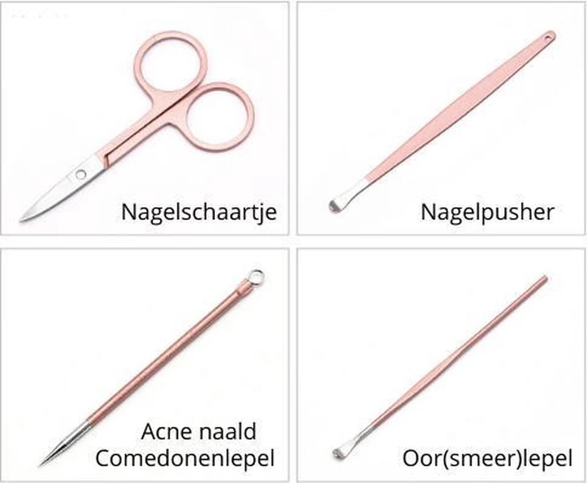 Met deze professionele 16-in-1 manicure/pedicureset haal jij in één klap alles in huis dat jij nodig hebt voor (alledaagse) persoonlijke verzorging! Bovendien is deze set, in prachtige roségouden uitvoering, voorzien van een luxe opbergdoosje waarin je alle tools na gebruik veilig kunt opbergen.