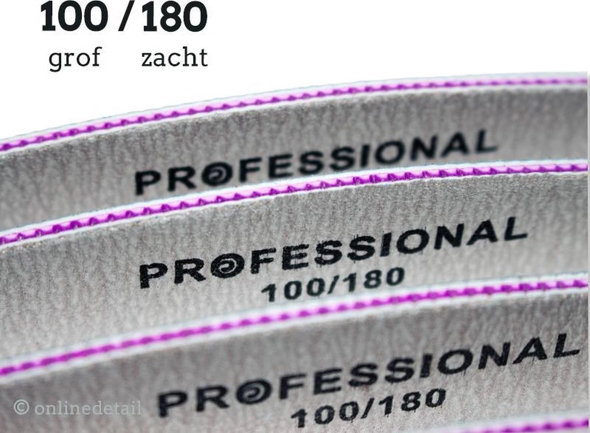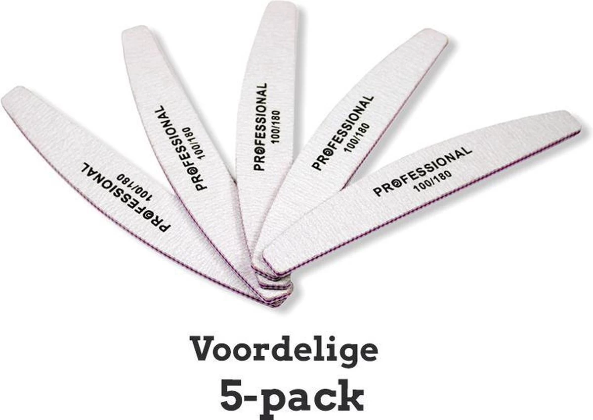 Voordeelverpakking van 5 professionele nagelvijlen van 100/180 grit. Nagelvijl voor acryl Nagels, gel nagels of natuurlijke nagels. Wasbaar en desinfecteerbaar. Set van 5 stuks. De halvemaan vormige vijl bevat een unieke vorm om dicht bij de nagelriem te vijlen voor de perfecte afwerking Vijlen zijn uitermate geschikt voor in de salon en voor thuis.