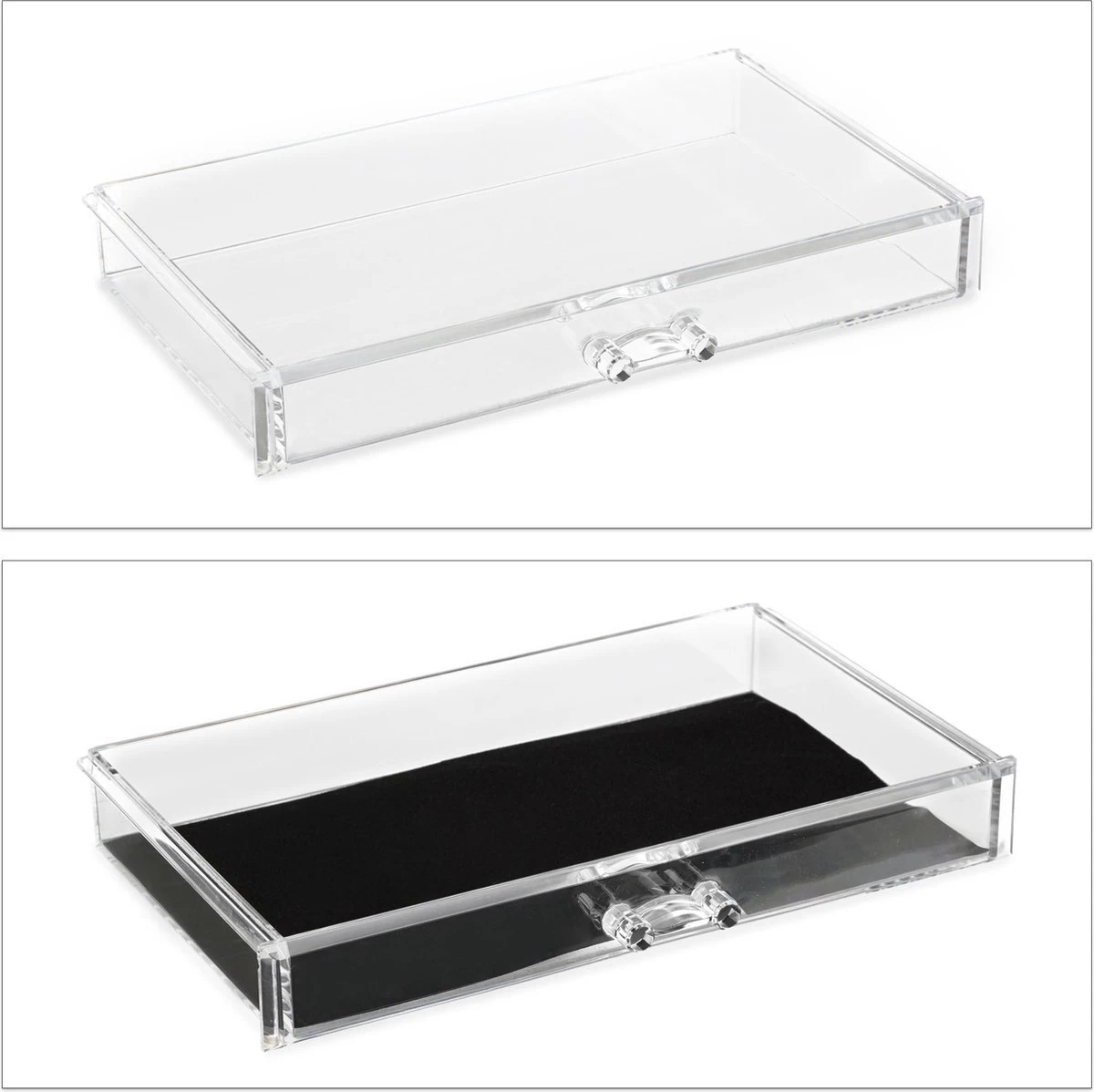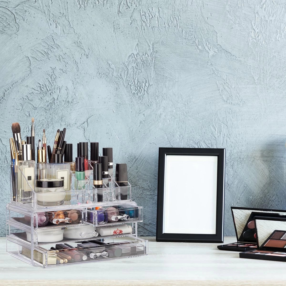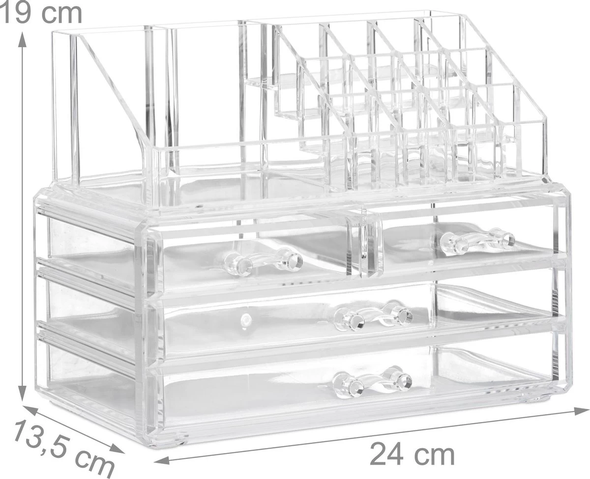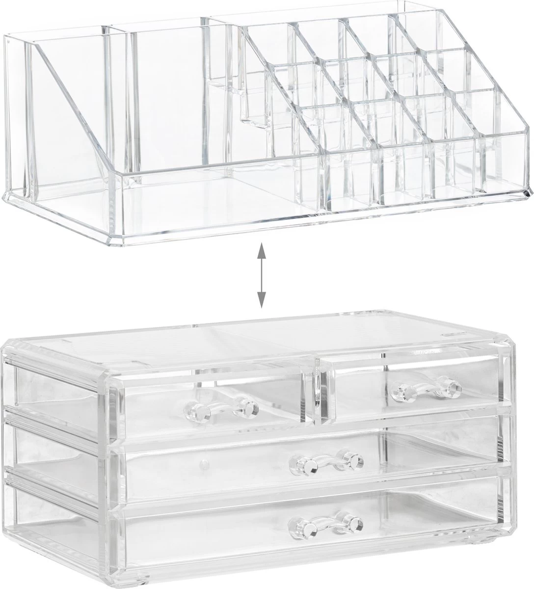 De stapelbare make-up organizer zorgt voor orde op je kaptafel en bespaart je het zoeken in je toilettas. De tweedelige make-up standaard biedt met veel opslagruimte voor cosmetica en sieraden. De lades zijn geschikt voor crèmes, poeder en oogschaduw, als ook voor ringen, kettingen en armbanden. De praktische houder voor lippenstift is ook geschikt voor nagellak, borstels, stiften en nog veel meer. Ook als bureau organizer of als opbergbox voor schroeven en gereedschap doet hij het zeker goed.