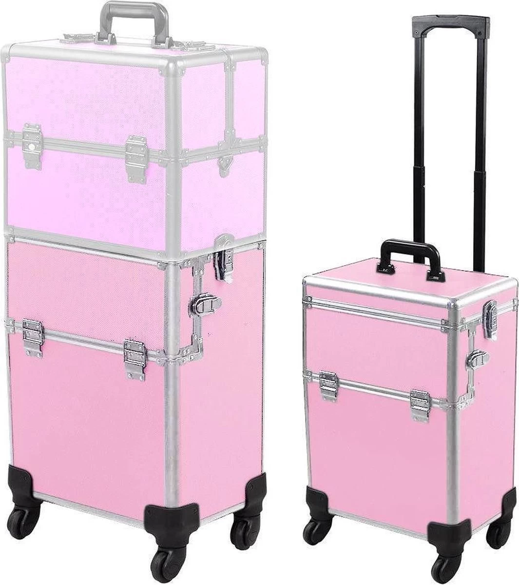 Zeer ruime tweedelige trolley op 4 zwenkwielen, welke via een kliksysteem eenvoudig te verwijderen/te vervangen zijn. De trolley is tevens voorzien van een uitschuifbaar handvat en wordt geleverd met een extra deksel. Ideaal voor schoonheidsspecialisten en stylisten, maar ook voor andere beroepen zou deze trolley een uitkomst zijn.